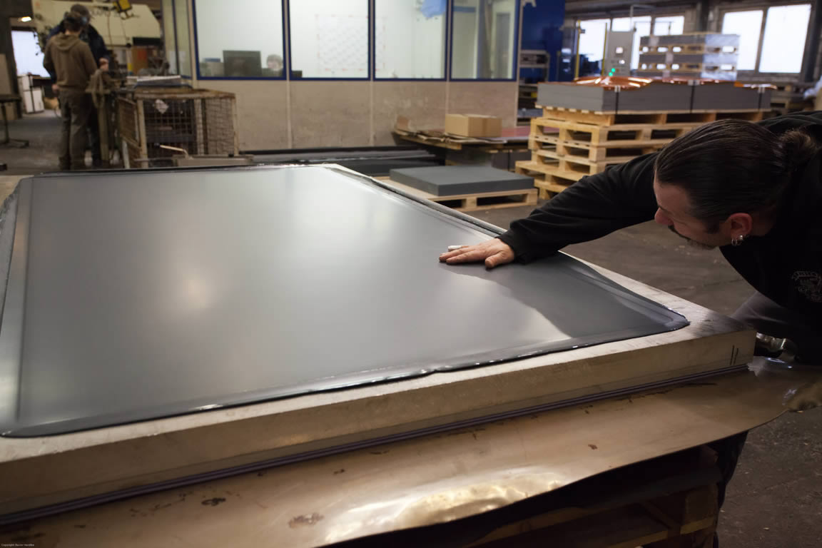 Technology with a horizontal press heated up to 300 degrees and a force of 2500 tons